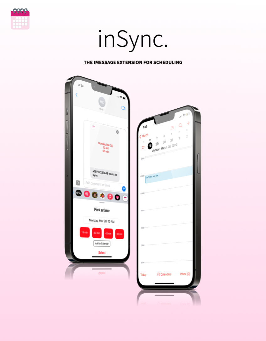 Birthed out of a personal frustration over connecting with friends, inSync offers an in-house solution to scheduling via iMessage Extension. In just three clicks, a user is able to plan, schedule and send a meeting request, without having ever left their iMessage conversation.